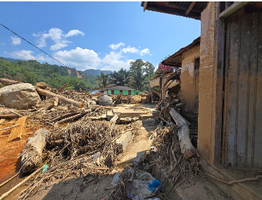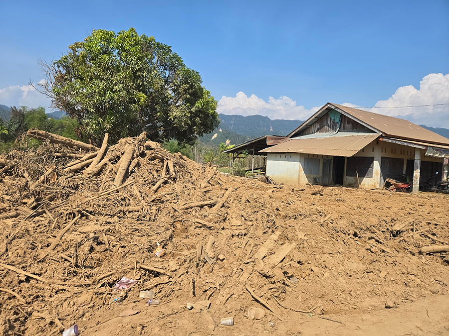 Located about an hour’s drive up a mountain road from Pandan District, this area has not received any aid other than that from A-PAD Indonesia. Field assessments have confirmed structural instability, including houses tilting due to significant land subsidence, highlighting the urgent need for sustained intervention.