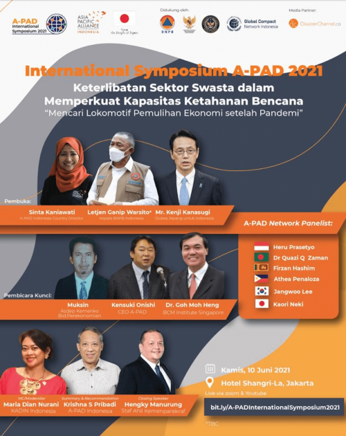 The Asia Pacific Alliance for Disaster Management (A-PAD Indonesia) in cooperation with DisasterChannel.co will host The 2021 A-PAD International Symposium with theme of Private Sector Involvement in Strengthening Disaster Resilience Capacity – Looking for the Locomotive of Economic Recovery after the Pandemic on: