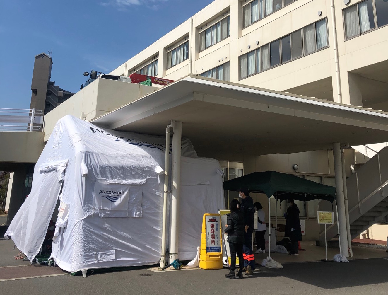 On March 13, ARROWS leased and installed an air tent at Hiroshima Kyoritsu Hospital. ARROWS has an MoU with the hospital for disaster assistance. The tent was set up next to the hospital entrance and will be used as a triage post to screen all incoming patients starting on March 16.