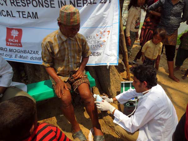 아시아퍼시픽얼라이언스(A-PAD)의 멤버인 다카커뮤니티병원 (Dhaka Community Hospital Trust, 이하DCH Trust)의 의료팀은 지진 직후부터 현지에 진입하여 카트만두에서 남동쪽으로 30키로 떨어진 카브레파란쵸크지역 (Kavrepalanchok)의 산간부에 위치한 7마을을 중심으로 지진에 인해 상처를 입은 환자를 치료하는 의료활동을 진행하고 있습니다.