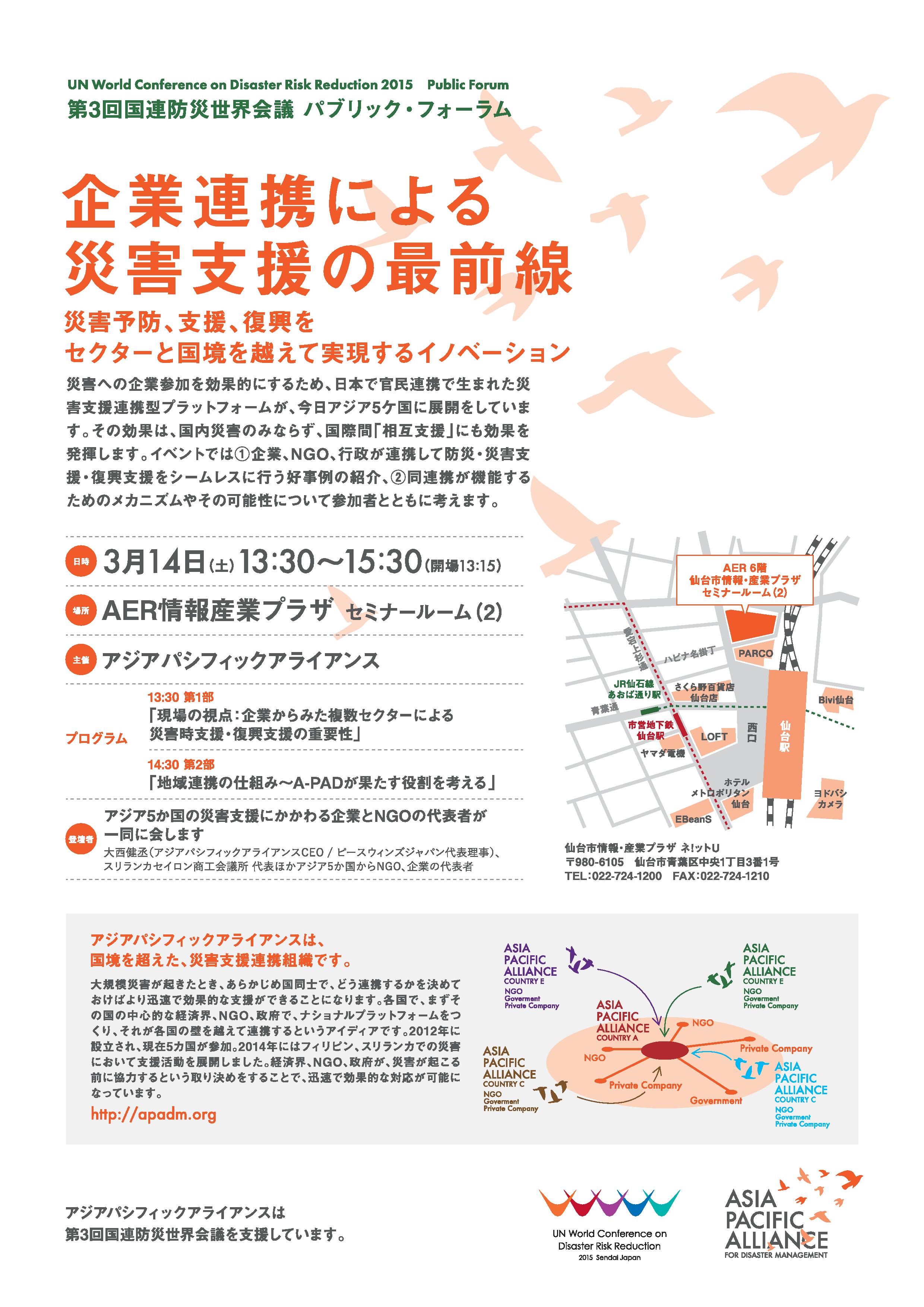 アジアパシフィックアライアンス(A-PAD)」は、来る3月14日、宮城県仙台市で開催される第3回国連防災世界会議(WCDRR)のパブリック・フォーラムで、「企業連携による災害支援の最前線?災害予防、支援、復興をセクターと国境を越えて実現するイノベーション」を実施します。