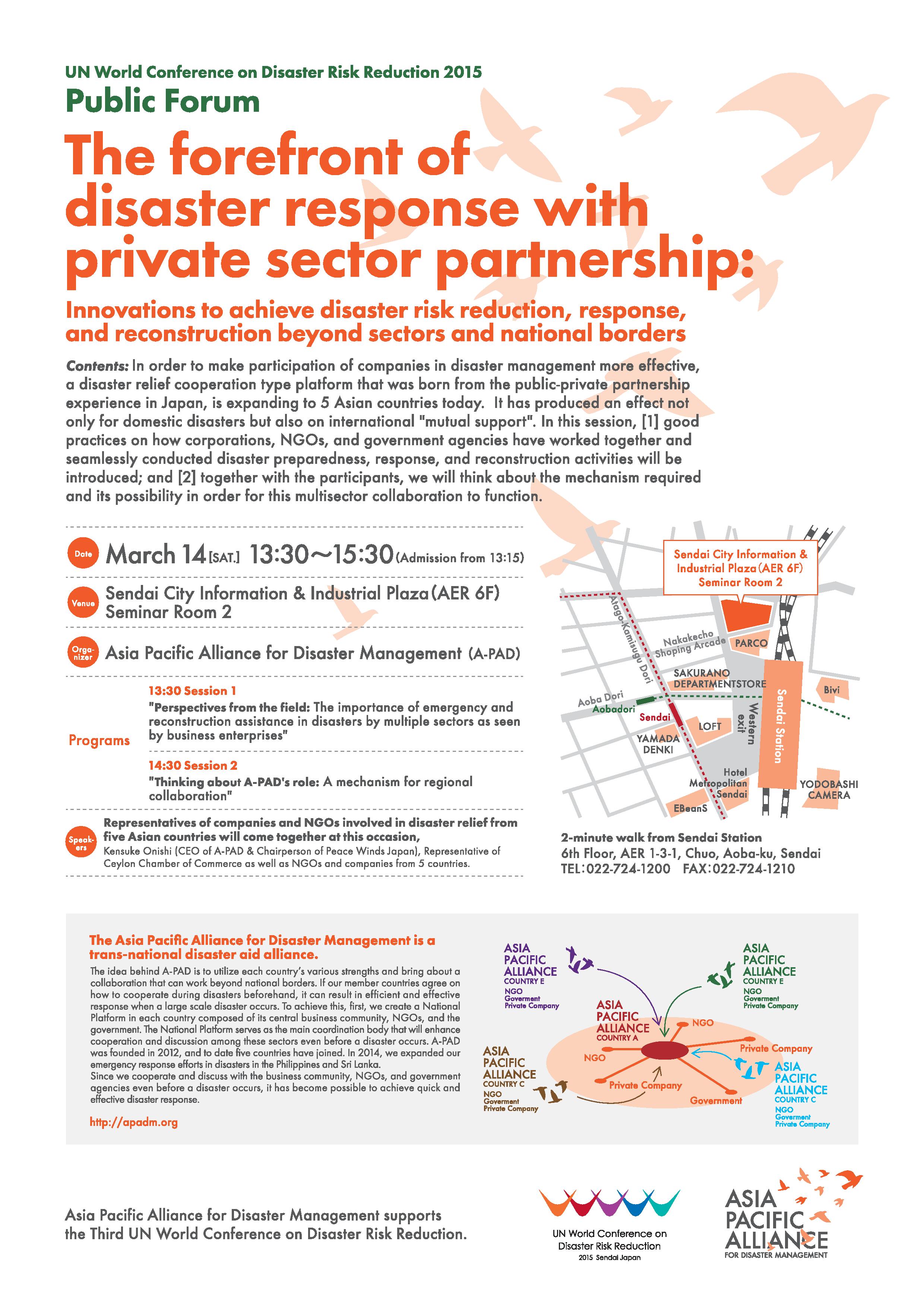 On the occasion of the 3rd UN World Conference on Disaster Risk Reduction, which will be held in Sendai City from March 14-18 2015, Asia Pacific Alliance for Disaster Management (A-PAD) will hold the Public Forum event “The forefront of disaster response with private sector partnership: Innovations to achieve disaster risk reduction, response, and reconstruction beyond sectors and national borders”. The event aims to discuss?good practices on how corporations, NGOs, and government agencies have worked together and seamlessly conducted disaster preparedness, response, and reconstruction activities as well as think about the mechanism required and the possibility of a multisector collaboration in DRR.